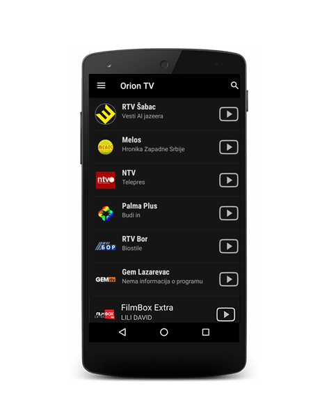 Najpopularnija i najbolje ocenjena aplikacija za gledanje televizije u pokretu. Orion TV je aplikacija koja omogućava da pratite TV program uživo na mobilnim telefonima i tabletima, bilo kada i bilo gde.